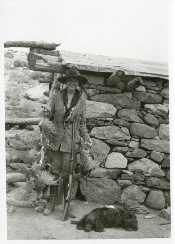 Backside text reads: 2/18-79 Helen with limit (4) of sage chickens in front of old stone house at Coyote. Base camp for sheep camp tender. Log cabin for cattle range foreman was about 300 yards form here. This was before the road was built to Coyote LHB