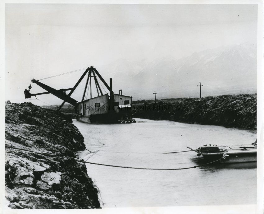Backside text reads: Aqueduct construction PHOTO CAPTION -- The electric dipper dredge was used for unlined canal construction work.