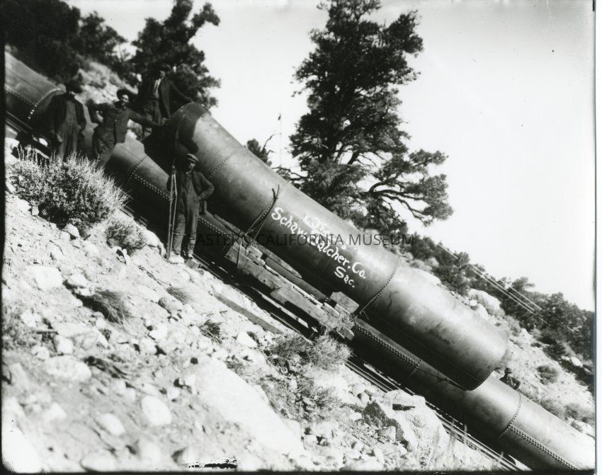 B&W glossy print: section of pipe for the aqueduct - side of pipe reads:The Schqw. Batcher Co. Sac.
