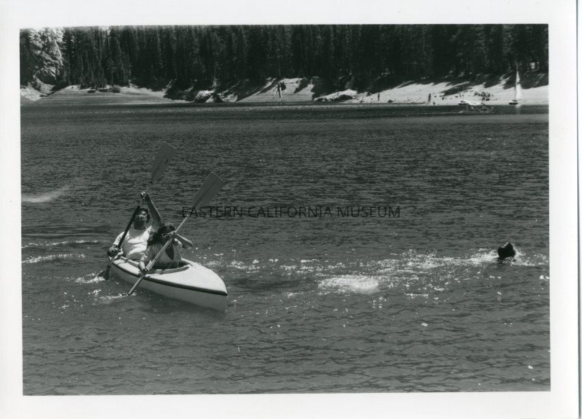 B&W matte print: people paddling a kayak in Horseshoe Lake, Mammoth