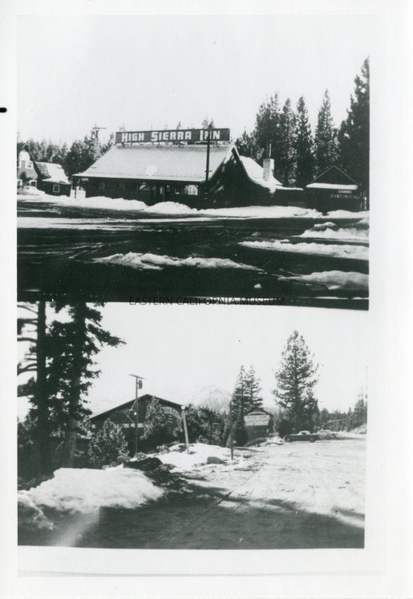 B&W glossy print: split image photo; bottom image old Arlberg Inn, Main Street, Mammoth Lakes