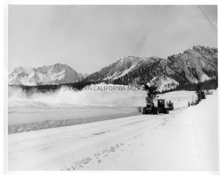 B&W glossy print: snow plows working along a road near town of Mammoth Lakes
