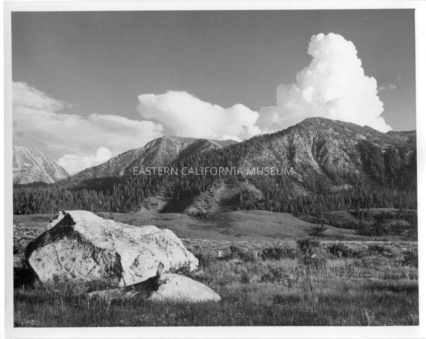 Backside text reads: Photo of Timbered Hills - some open meadow land. Seems to be, or has been, Fenced - Huge Light Colored Boulder in Foreground - Mammoth Looking South over Mammoth Meadows