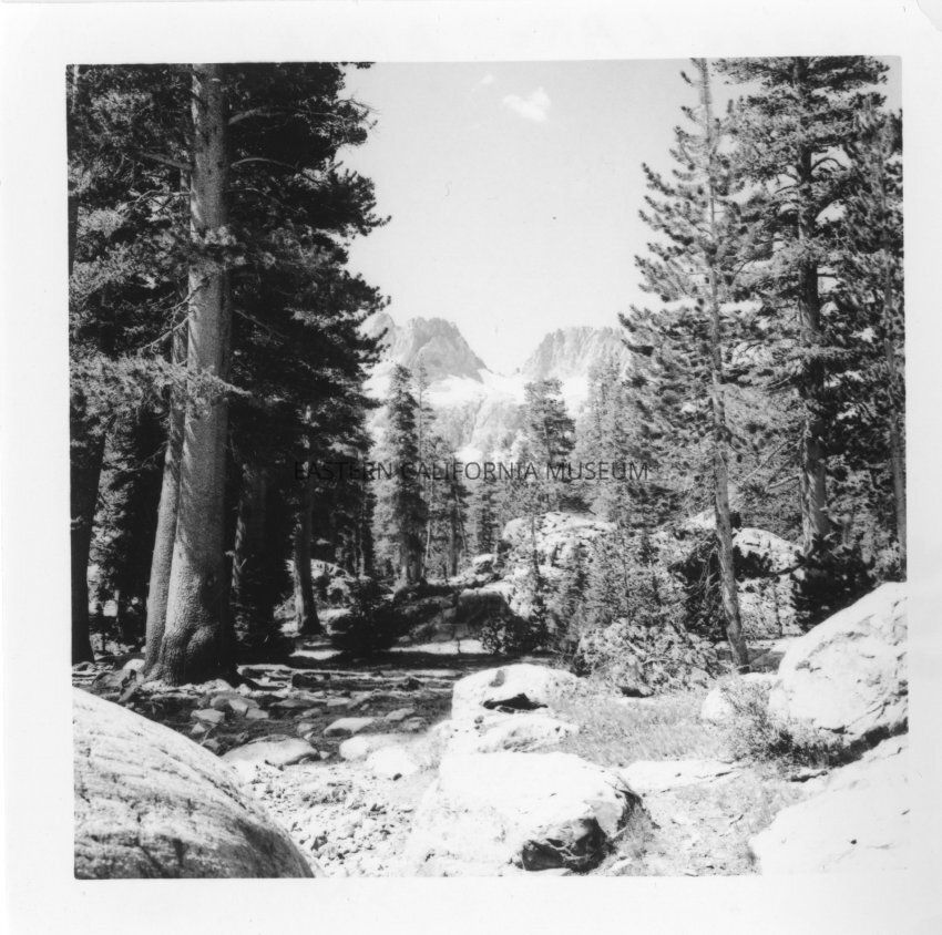 B&W glossy print: boulders in foreground, snow covered peaks in background