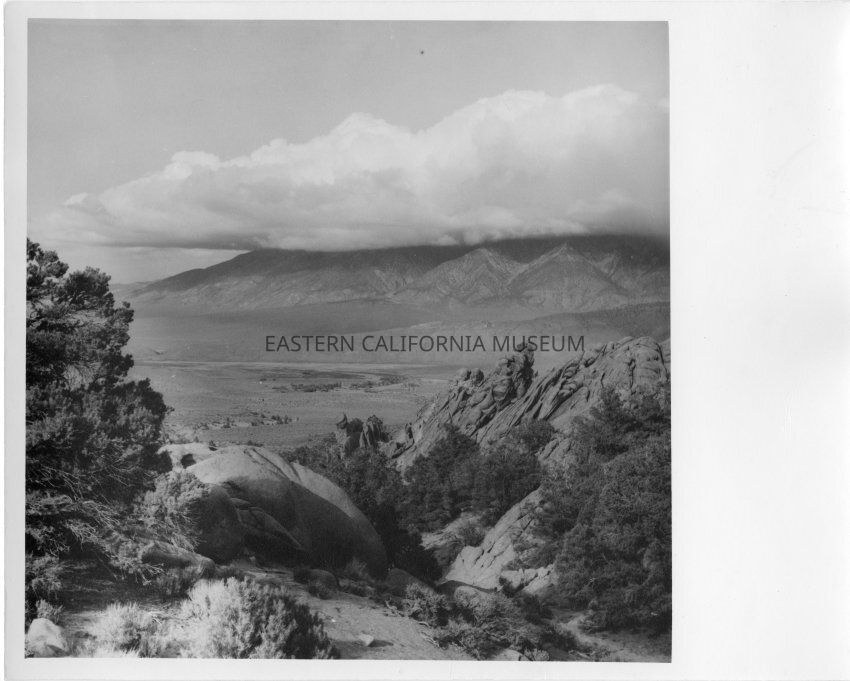 B&W matte print: boulder slope in foreground with valley floor and cloud covered peaks in background