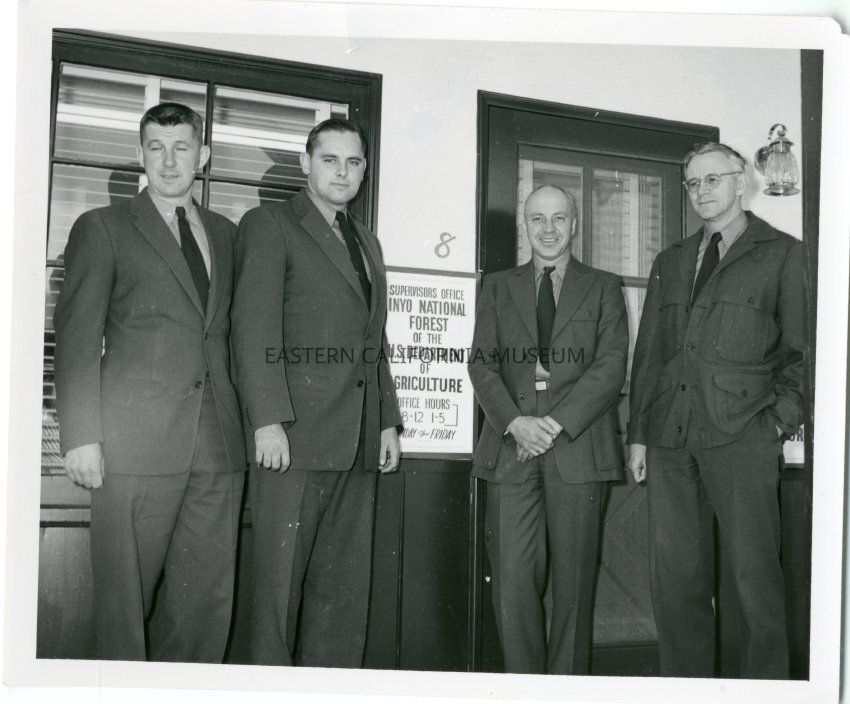 B&W glossy print: 4 men in suits standing in front of a forest supervisors office