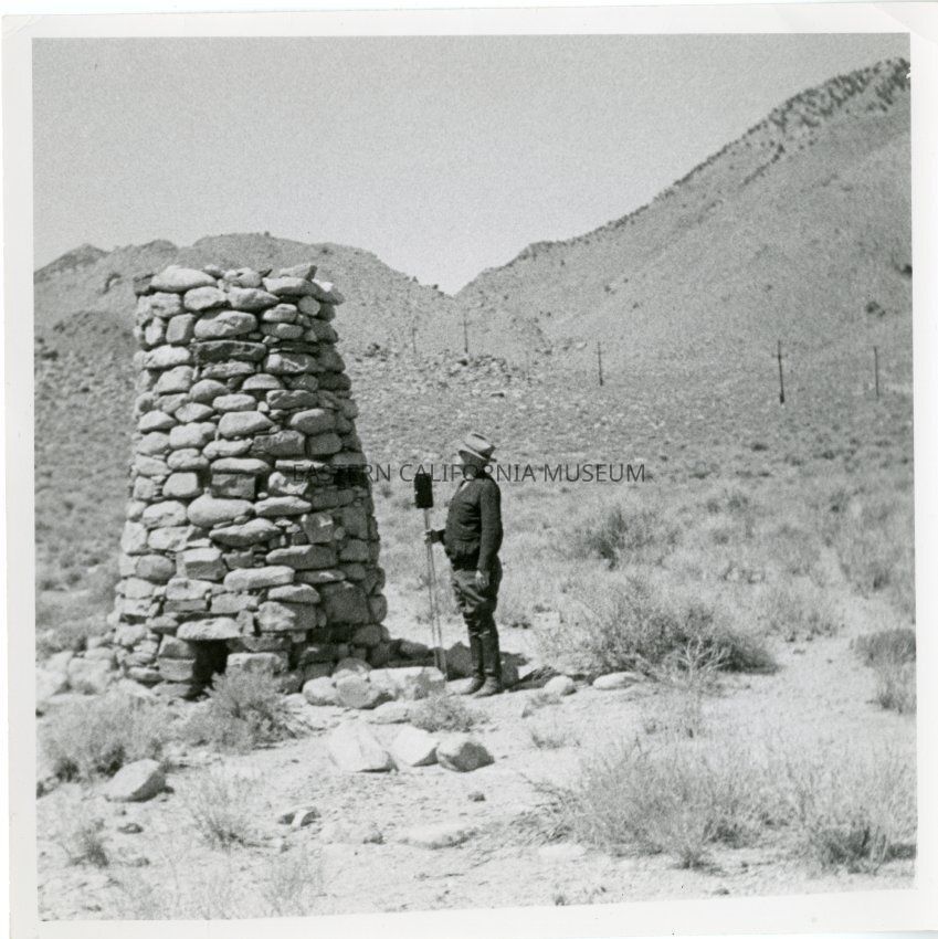 B&W glossy print: man standing besides what appears to be a rock tower or furnace, man may be holding a camera on a tripod