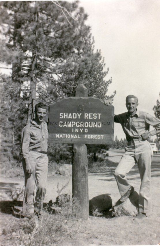 Sepia glossy print: 2 men standing next to sign for Shady Rest campground