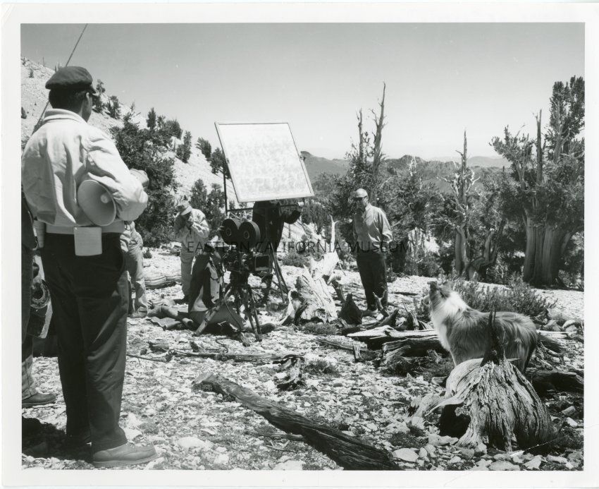 Backside text reads: Filming of "Lassie" show (for television series) - at Patriarch Bristlecone Pine Forest - 1964 Lee Prather Photo