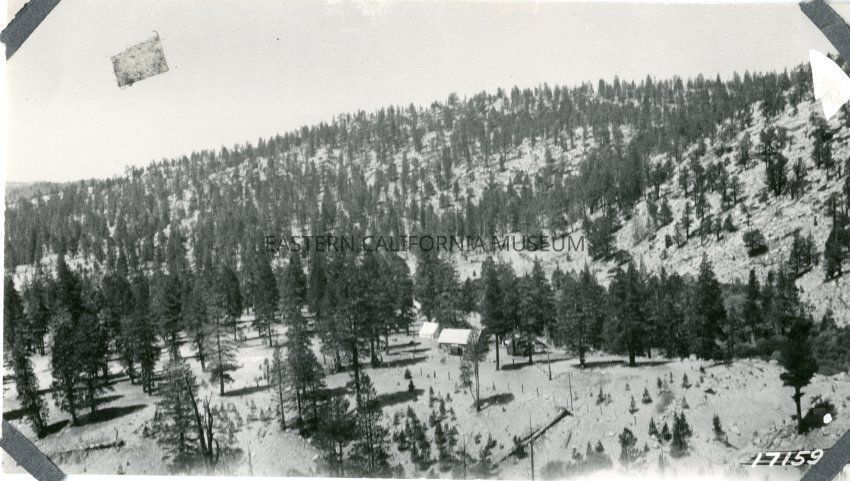 B&W glossy print: hills with trees, 2 buildings in a valley with fencing