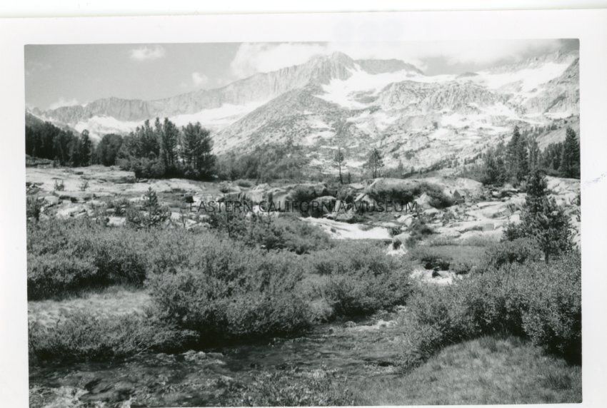B&W glossy print: high alpine stream with snowy peaks in background