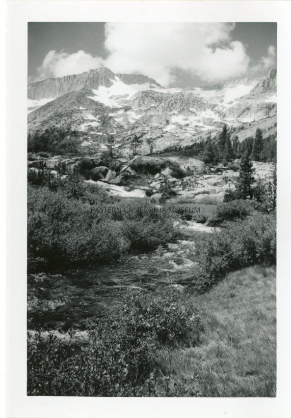 B&W glossy print: stream, meadow, snow capped peaks, clouds