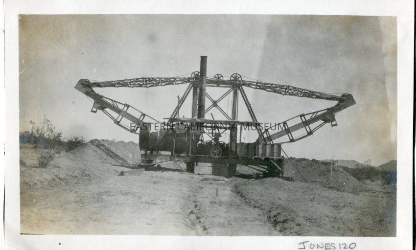 A steam-powered machine used in the construction of the L.A. Aqueduct. The machine rests on wooden rails.