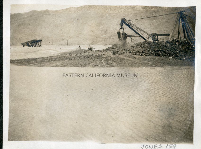 Marion steam shovel excavating channel for L.A. Aqueduct. Hydraulic Hose, top center, is washing down material as it is excavated.
