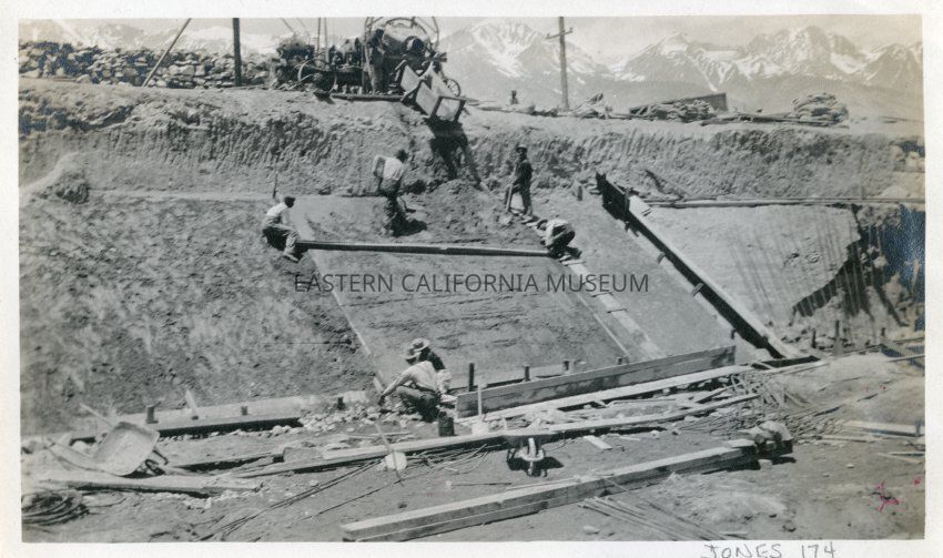 Photo of the "Dressing Crew" preparing ditch for cement lining during the construction of the L.A. Aqueduct. Note cement unit in the upper center of print.Collection