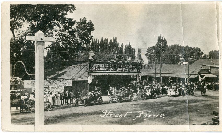Photo titled, "Street Scene." It shows crowds lining Bishop Main Street in front of the Marks & Cohn store. There are several early automobiles parked alongside the street, and at least one horse-drawn buggy. There is a sign partially hidden by a (telegraph?) pole that says, "...presents the...greatest features...pilgrimage to Los Angeles, Cal." Possibly taken during the Harvest Festival in 1912.