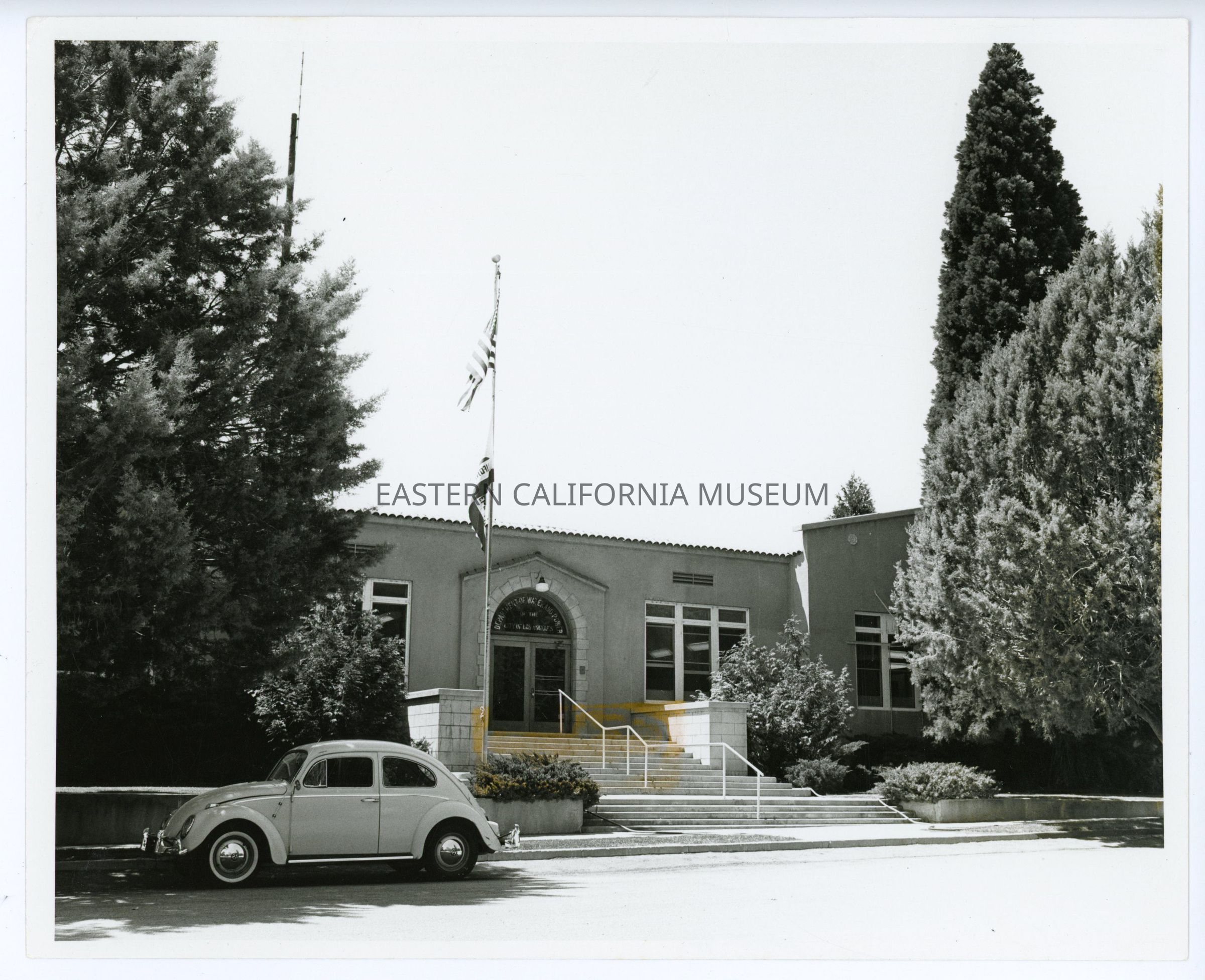 There is a flagpole flying the U.S. and California flags and a Volkswagon bug parked in front. This building was demolished in the mid-1980s, and later headquarters were moved to Bishop.