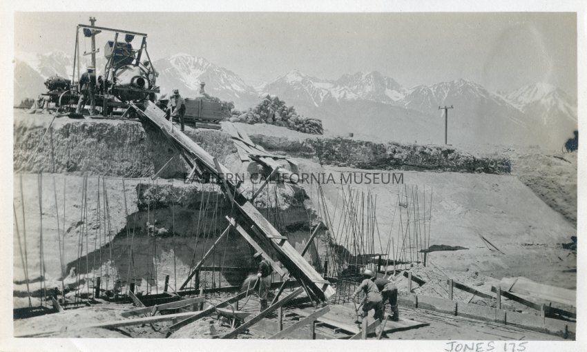 Cement machine, flume, and laborers pouring and finishing cement at L.A. Aqueduct intake.