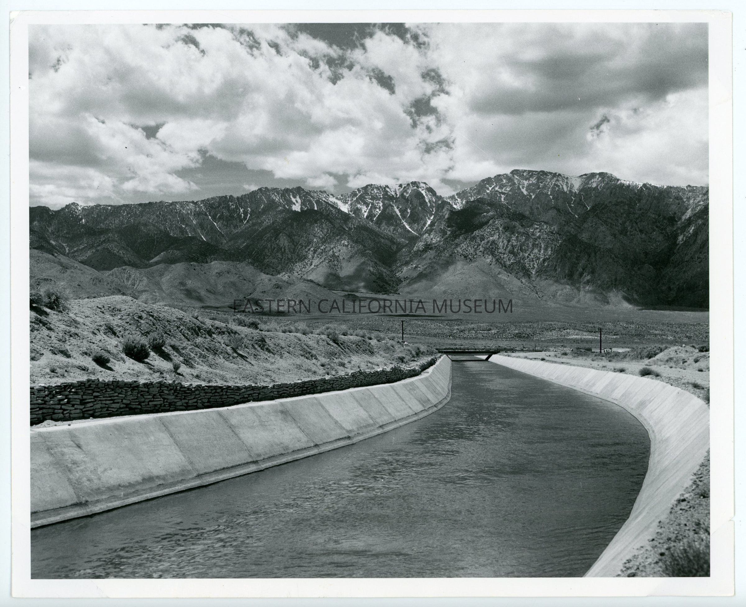 Shows an open, concrete-lined section of the aqueduct. There is a dry-laid rock wall on the left side and a bridge across the aqueduct in distance. This section of the aqueduct had a capacity of 900 second feet and stretched for 37 miles from Alabama Gates to Haiwee Reservoir. [source?]Collection