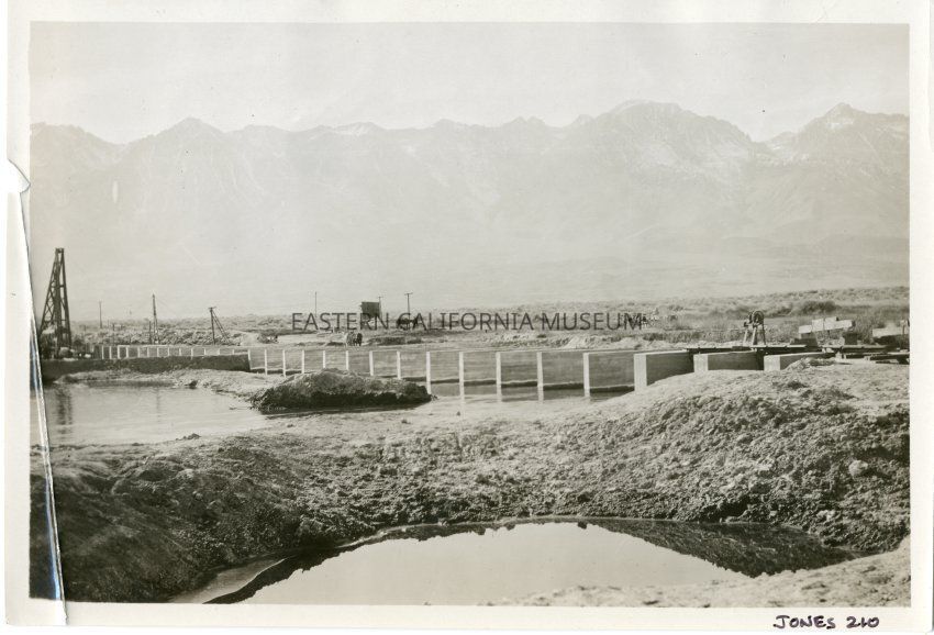 Diversion weir near L.A. Aqueduct intake. Horses and wagons in background. Machine in left center may be a piledriver. Photo taken looking from downstream side of weir west to Sierra Nevada mountains.Collection