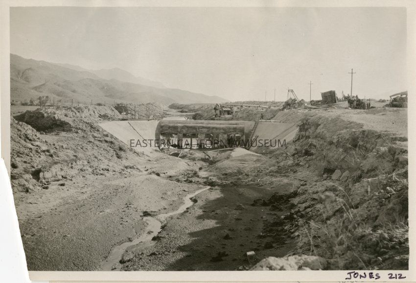 Construction of the L.A. Aqueduct intake. Note the cement mixer at upper right and laborers in the shadows. Photo taken looking from upstream side of intake south down the Owens Valley.Collection