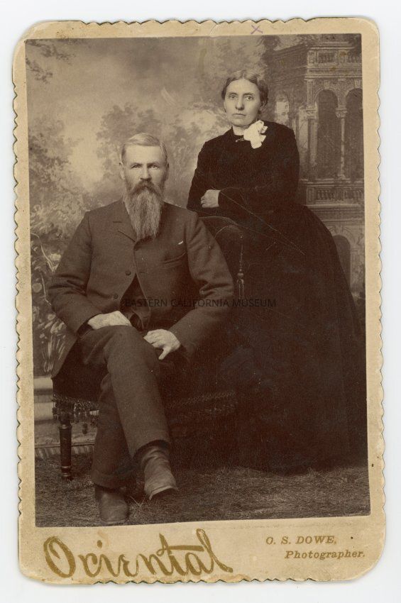 Mounted full-length studio portrait of a man and woman. They are identified on the reverse as J. Harvey Shannon and his wife Susan. He was a teacher and the Inyo County Superintendent of Schools from 1895-1898. Photographer was O. S. Dowe (Oriental Studio?).Collection