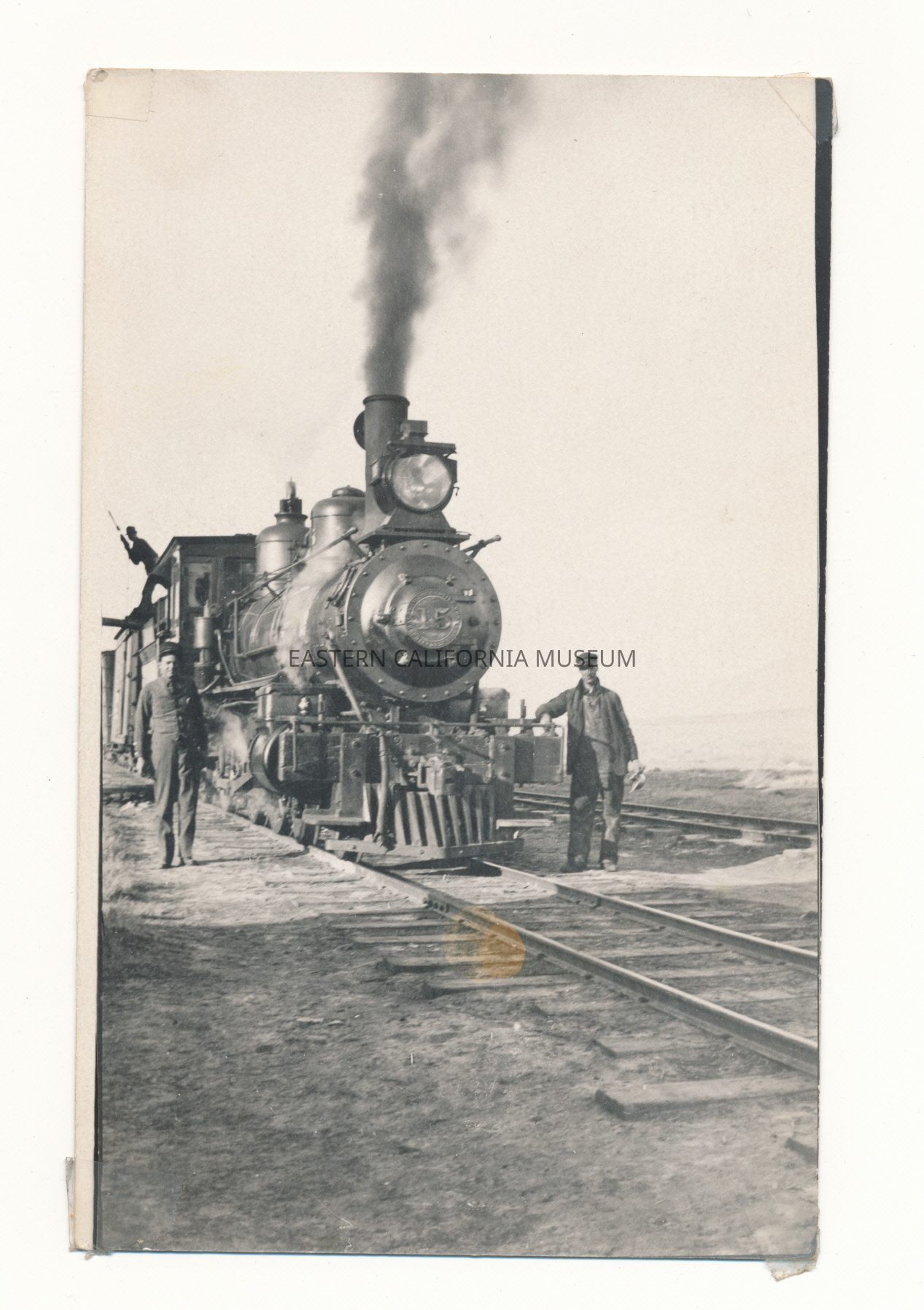 Photo postcard of engine #15. There are two men standing on either side of the engine while a third man is on top of the train. According to Brian Norden the third man is operating the water spout on the water tank next to the tracks to fill water in tender.
