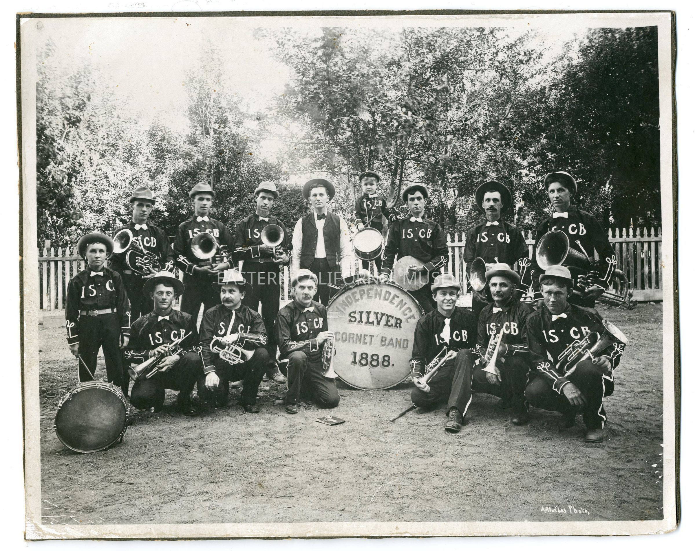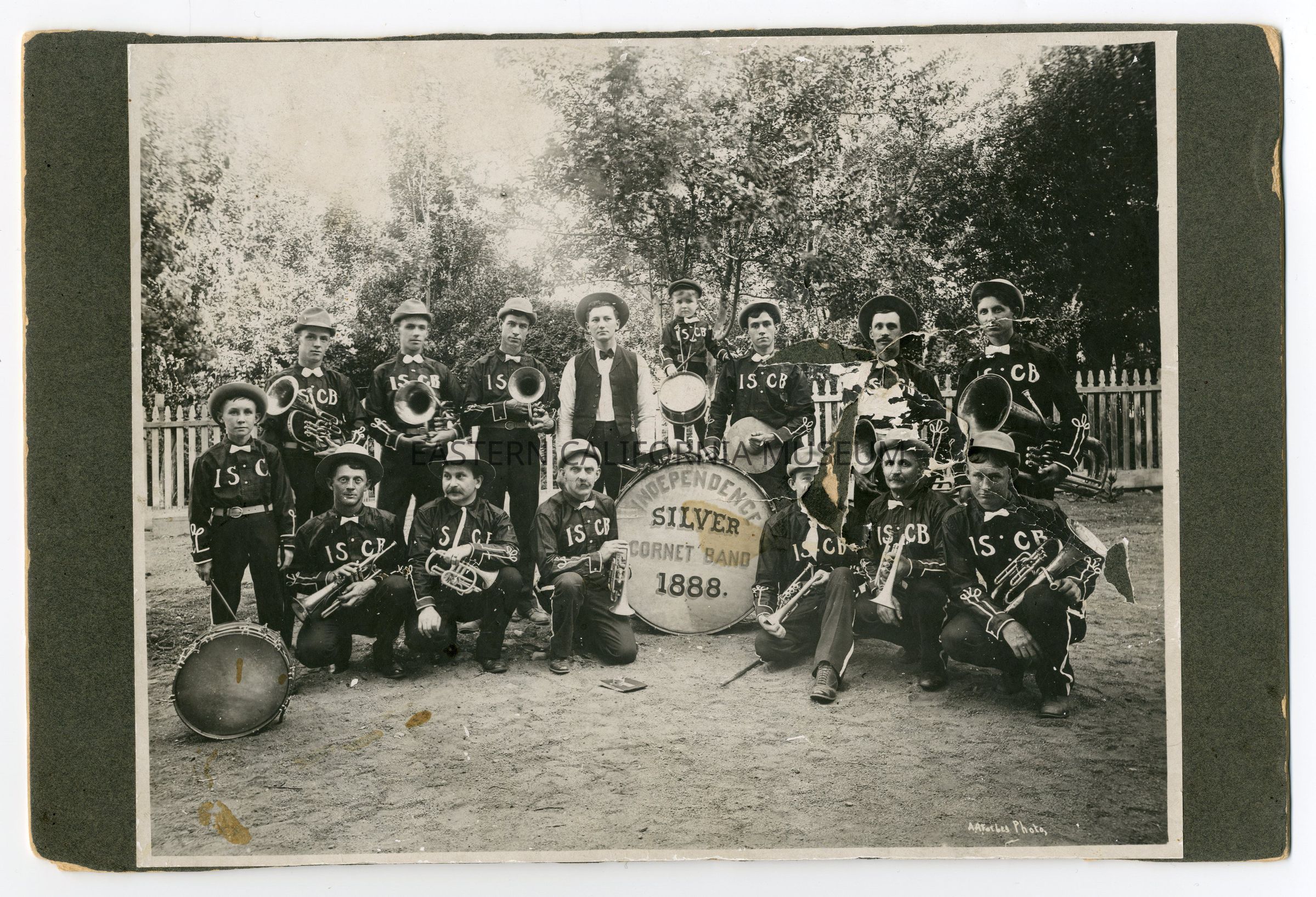 Large mounted photo of the Independence Silver Cornet Band with their instruments. The photographer was A. A. Forbes. This photo is badly damaged, but there is a second copy of this photo in the same envelope that is in better condition.