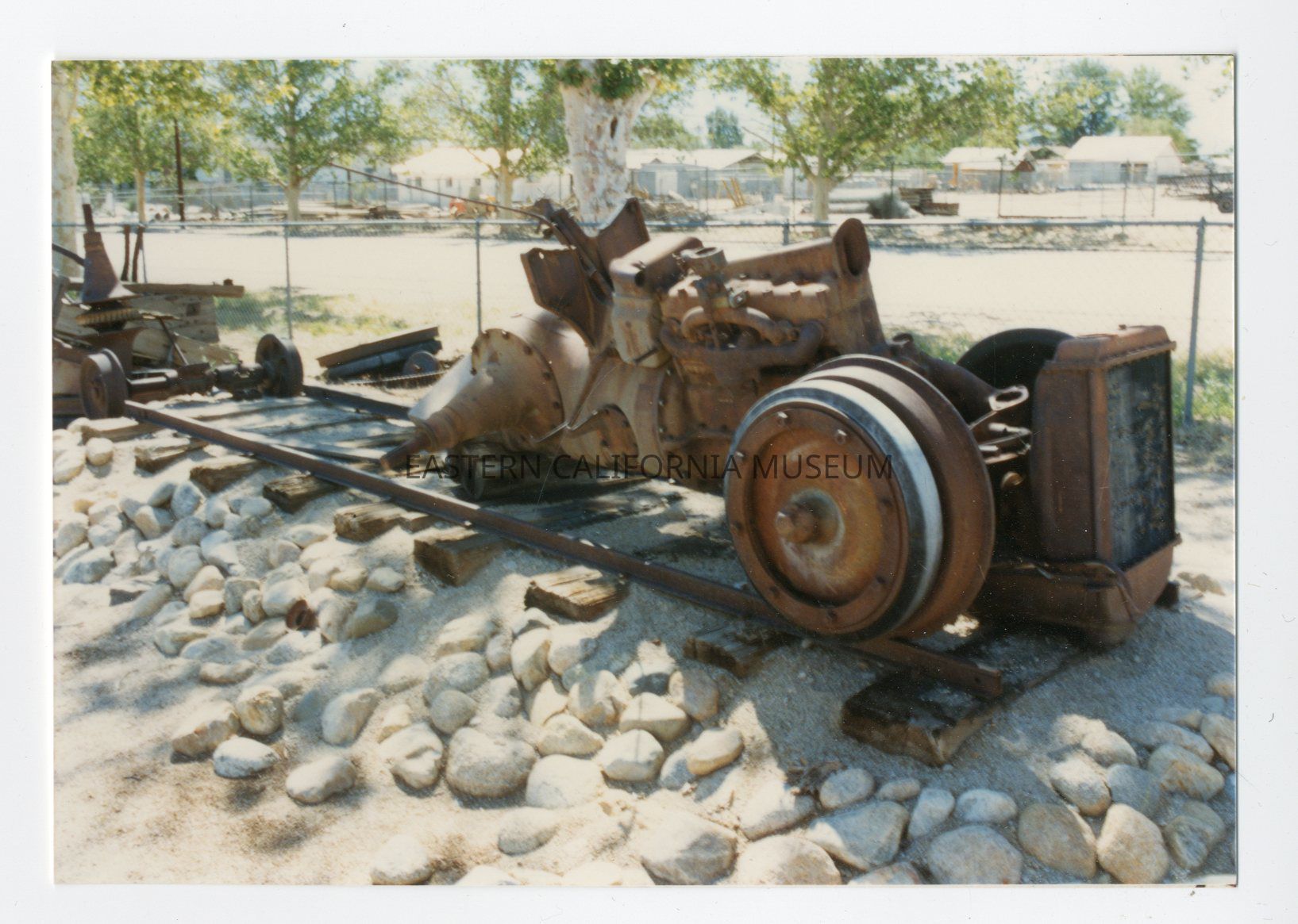 No. 18. This was a Fordson farm tractor that was adapted to rail use and used by the DWP in raising the height of the dam at the agricultural water reservoir up Big Pine Creek that increased the capacity of Second Lake. The original reservoir on Big Pine Creek was built by local farmers. The tractor was disassembled, packed on the backs of mules, and hauled up to the reservoir site. Some of the heavier parts had to be carried between two mules. On a straight stretch this is not much of a problem since the weight is placed between the mules and they move in tandem. It was a different story on the trail up Big Pine Creek. The trail was "one-mule wide" in many places, with many switchbacks. The solution was to place a wagon-type bolster with kingpin on each mule. Poles were attached and the heavy part was suspended on the poles between the mules. When the mules came to a tricky spot the bolster/kingpin would turn very sharply, if necessary, and the mules and cargon would continue on. The Fordson equipment was too heavy to get back down after the reservoir was raised so it was left on the site. A few years ago a helicopter brought the remains of this equipment down from the mountain.