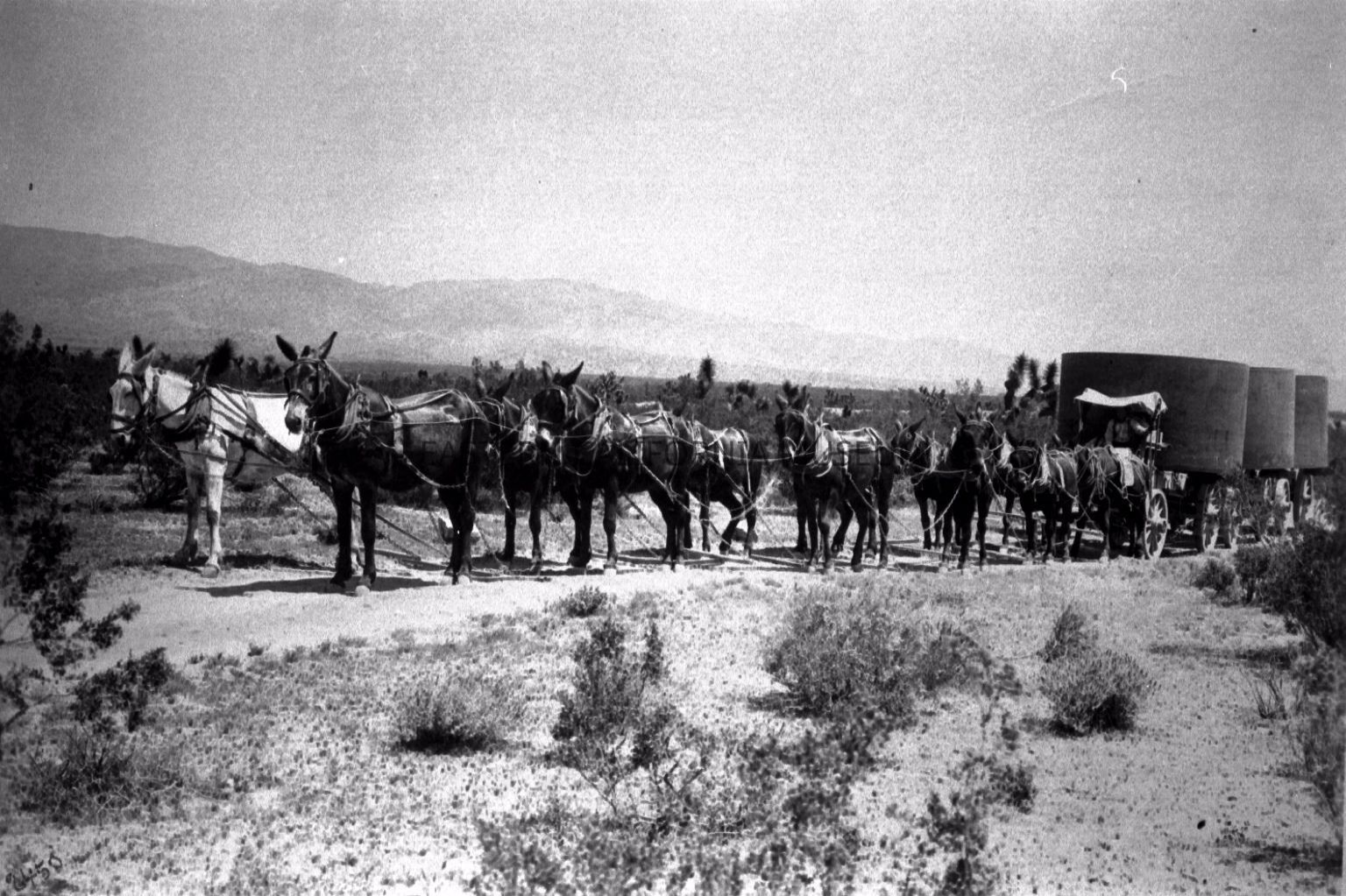 B & W digital scan of Ten Mule Team and Wagon hauling Pipe Sections across the Mojave Desert for constructing LA Aqueduct Inverted Siphon, location unknown.Collection