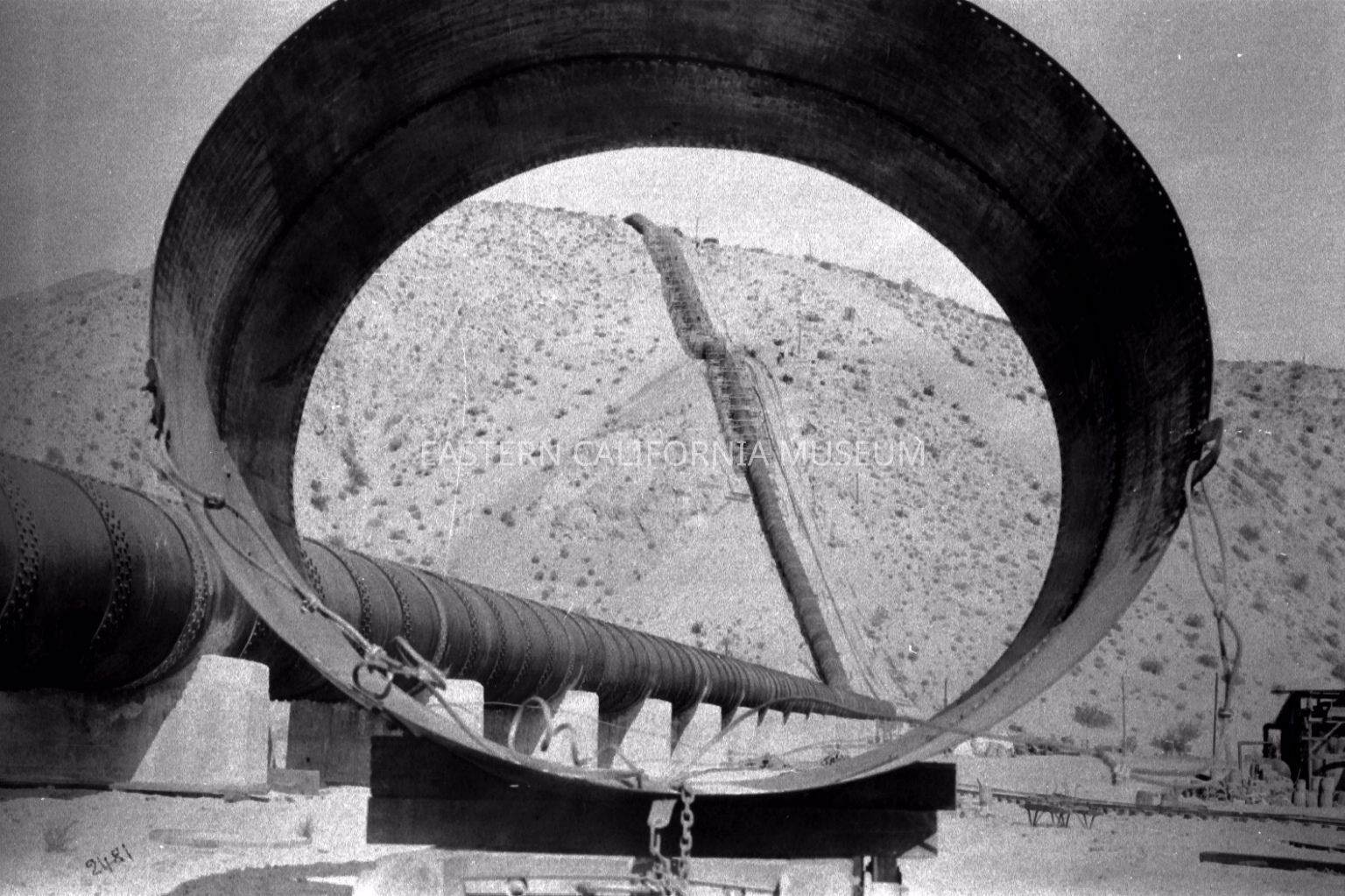 B & W digital scan looking through Steel Pipe Section ( possibly 11' 6") at nearly completed LA Aqueduct Inverted Siphon on canyon bottom and moving uphill. (Upper part of hillside section is still under construction, note, netlike scaffolding.) Also note cable mount hanging from steel pipe which enables it to be hauled uphill by a Cable Winch.Collection