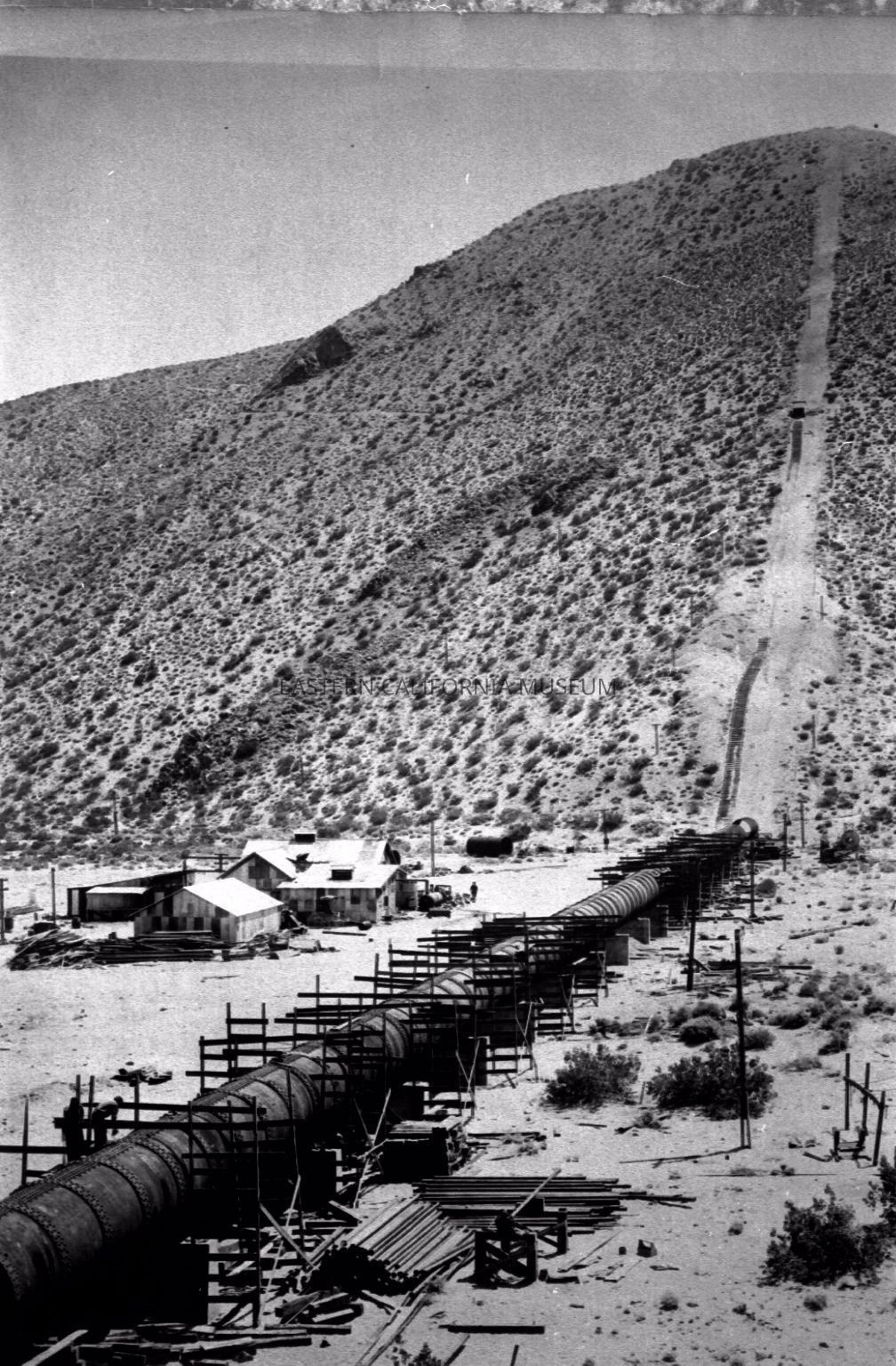 B & W digital scan of South end of the Jawbone Canyon Siphon under construction along the LA Aqueduct, Jawbone Division. White buildings in background may be equipment or machine shops to support Siphon construction. "The Jawbone siphon, although not the longest, or the greatest in diameter, operates under the greatest head. It is located near the center of the Jawbone Division. It is 7096 feet long and operates under a maximum pressure of 365 pounds per square inch. The 850' hydraulic drop was the largest of all the siphons constructed." LA Aqueduct Construction, Final Report, 1916, pg 219.Collection