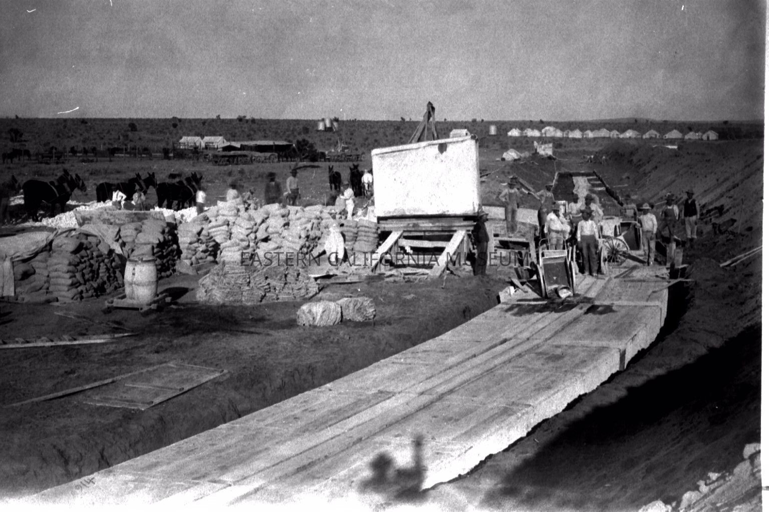 B & W digital scan of LADWP Labor Crew Concreting top of Covered Conduit on LA Aqueduct Project, Desert Divisions. Image displays various stages of work. Camp, consisting of Tent Houses visible in upper right corner.Collection