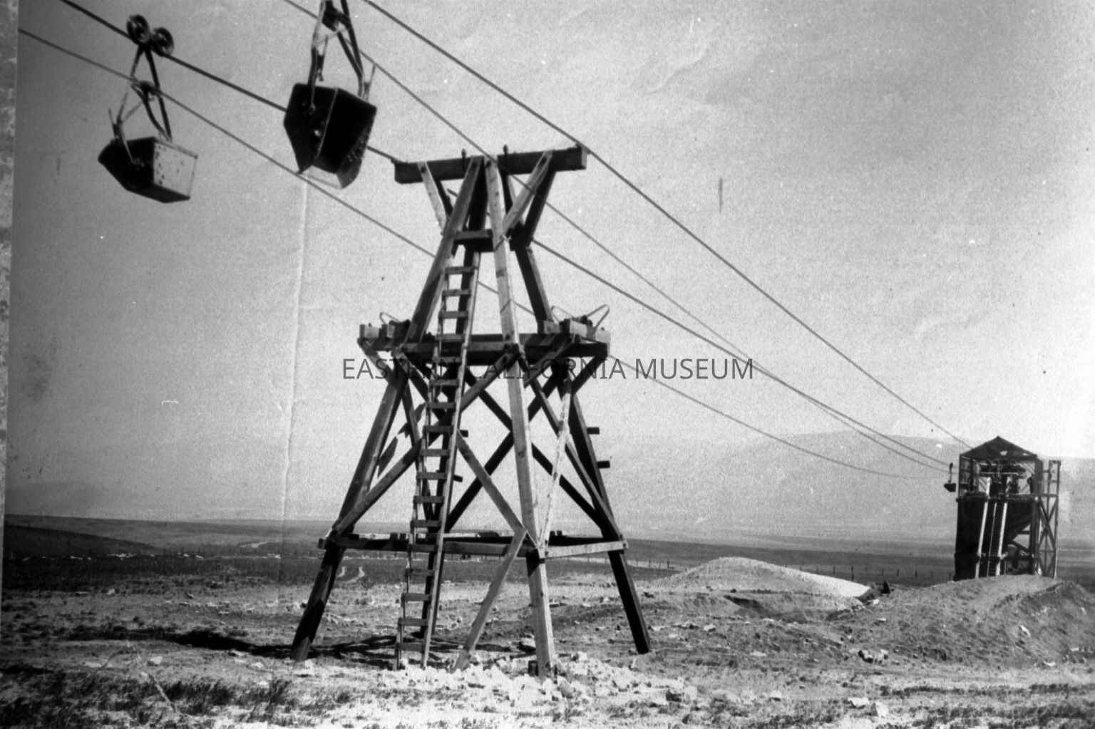 B & W digital scan of Aerial Tram with Tower, Buckets and Terminus Structure. The tram was built by LADWP to haul limestone from their South Quarry for the manufacture of cement for the LA Aqueduct.Collection