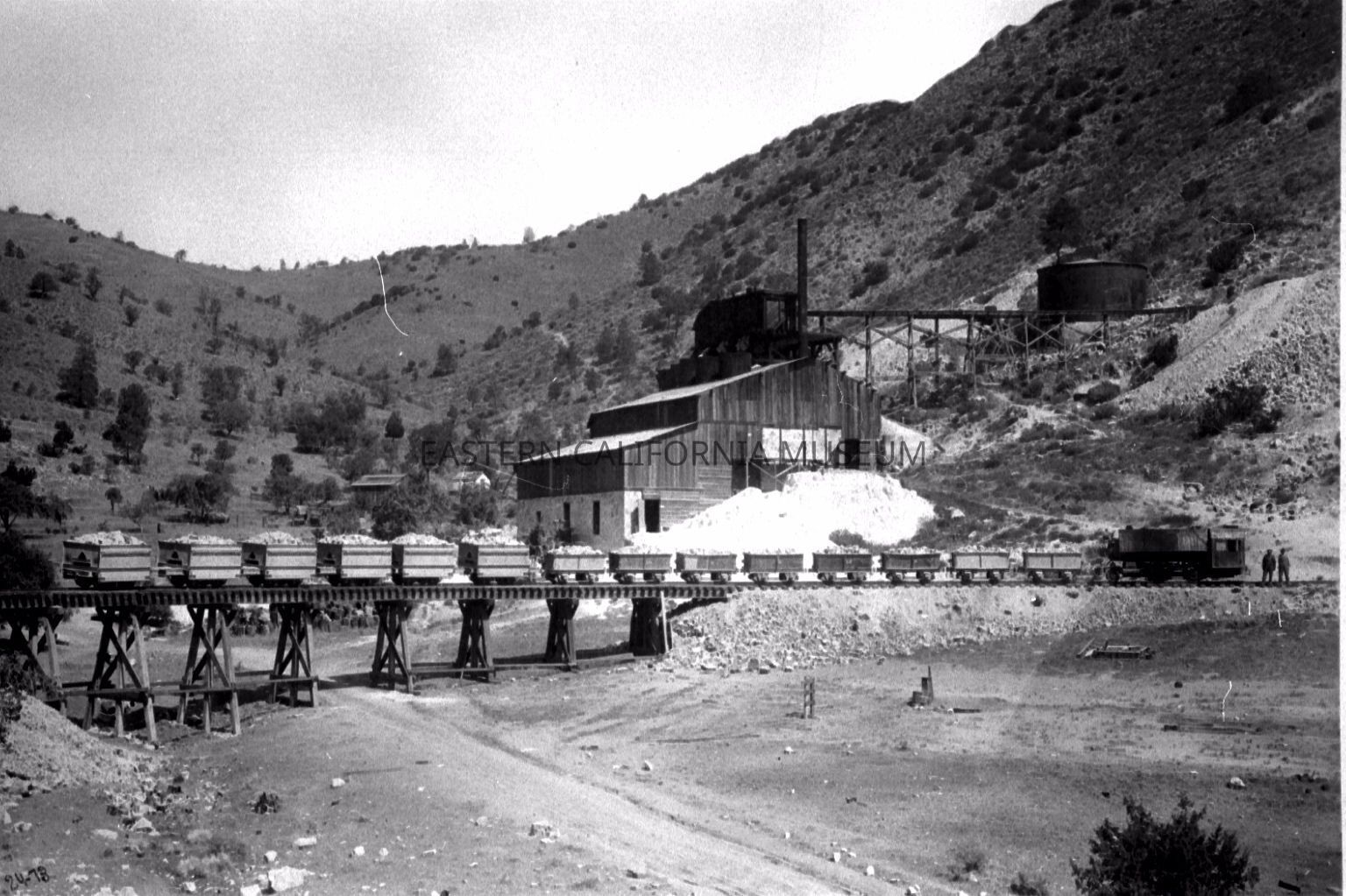 B & W digital scan of LADWP's Limestone Mill and Train with full orecars destined for the Monolith Cement Plant, location; South Quarry.