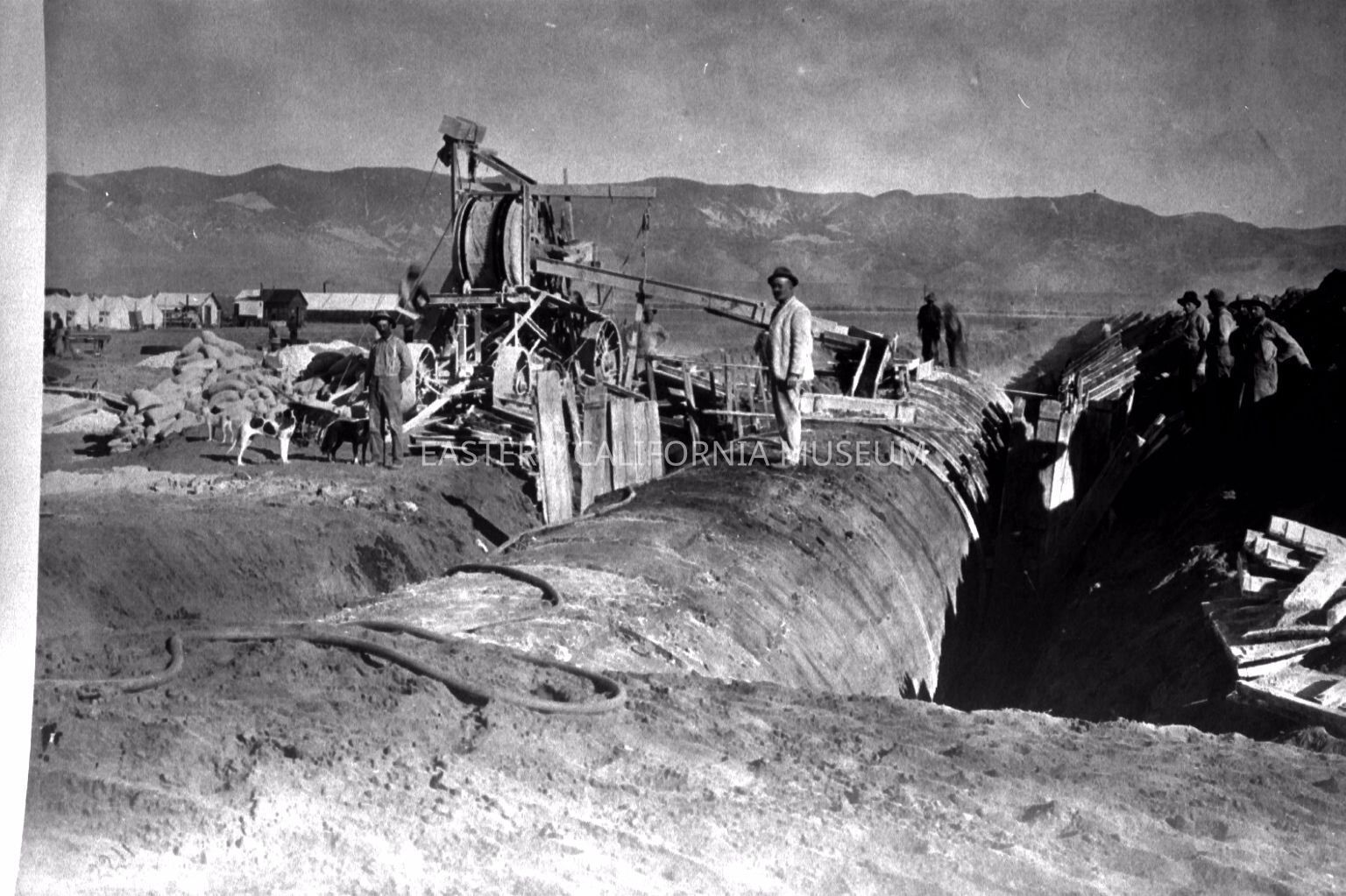 B & W digital scan of LADWP Employee standing on LA Aqueduct Concrete Pipe (Siphon), possibly the Antelope Valley or Whitney Canyon Siphon. There were 11 concrete pipes on the LA Aqueduct system all of which were 10' in diameter and capable of handling head pressures of 40 to 75' The reason for building concrete pipes was that they were estimated to be cheaper and better for heads less than 75'. The Concrete Pipes were buried in trenches and covered with soil. -from LA Aqueduct Construction, Final Report, Construction of Siphons, pg. 209.Collection