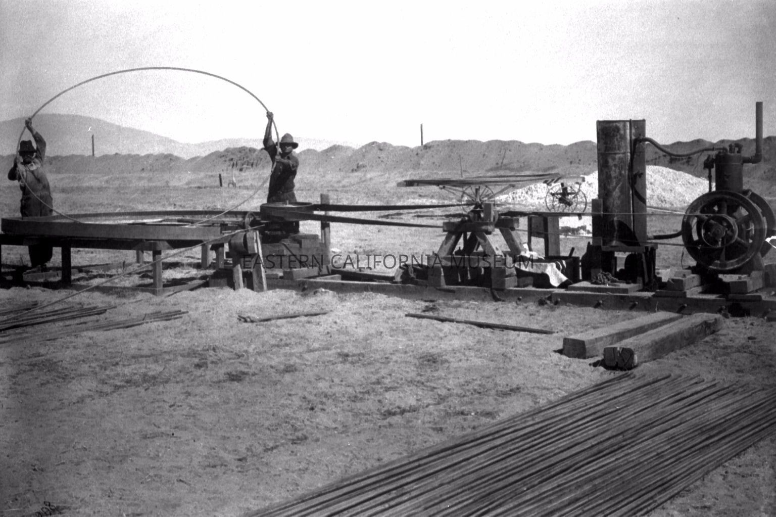 B & W digital scan of LADWP Laborers fabricating steel rods to be used as reinforcement in Concrete Pipe Sections of LA Aqueduct Project. Note earthen berm in background of image creating by excavating a trench for Concrete Pipe.Collection