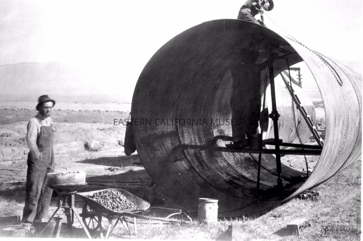 B & W digital scan of LADWP Riveting Crew at work on Siphon Pipe Section, location unknown. Pictured are Riveter, on top of Pipe, Sticker, inside of Pipe and Heater tending the Rivet Cooker.