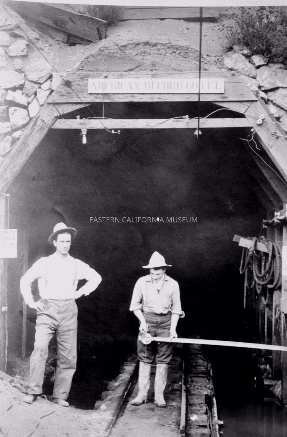 B & W digital scan of LADWP Miners at South Portal of Elizabeth Tunnel, , where American Hard Rock Record of 604' was made during a single month, April, 1910. "In this tunnel, where speed was particularly desired, the muckers, who had the hardest work to do and who largely controlled the rate of advance, worked in relays. The entire 26,870' of the Elizabeth Tunnel was completed February 28, 1911. The four years and seven months timetable set for the driving of this tunnel was beaten by 450 days or 32 per cent." from LA Aqueduct Construction, Final Report, Tunnel Construction, pg 151.Collection