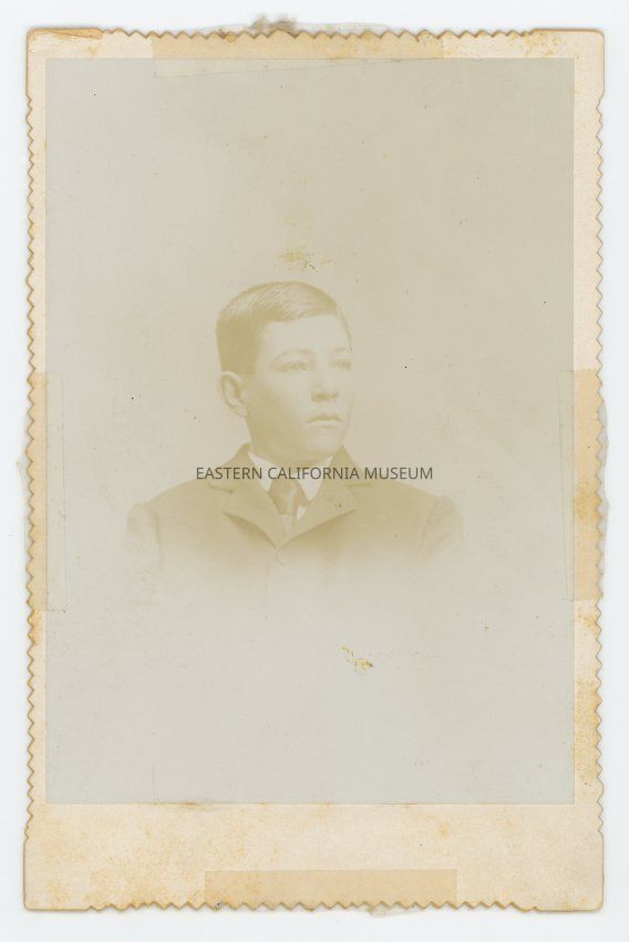 Mounted bust-length studio portrait of a young man. He is identifed on the reverse as Frank Dearborn, born June 24, 1882 in Aurora, NV. The photo was taken in 1900.