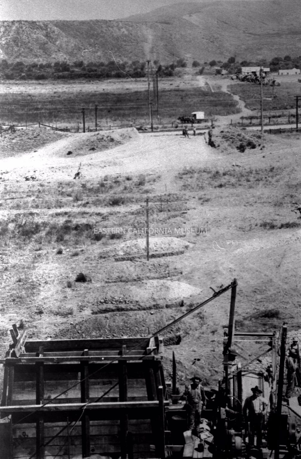 B & W digital scan of LA Aqueduct Construction. Possibly preliminary work being done for constructing a Siphon.