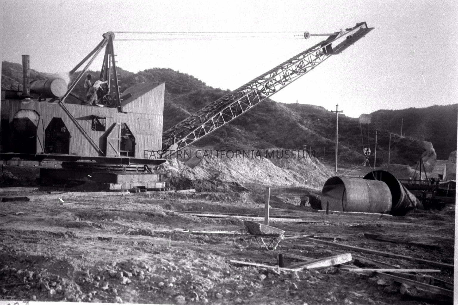 B & W digital of LADWP Steam-powered Crane lifting Siphon Pipe Sections into Trench on LA Aqueduct Project. Note Laborers on top of Crane making adjustments.Collection