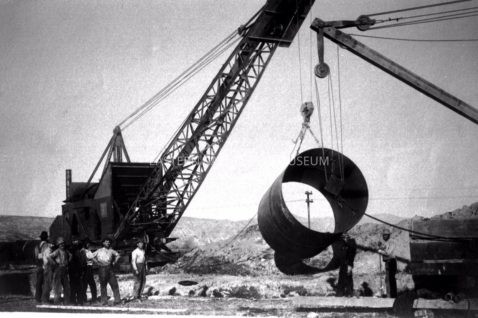 B & W digital scan of LADWP Steam-powered Crane lifting Siphon Pipe Sections into place on LA Aqueduct Project. Other crane pictured on right. (Unclear whether Pipe being lowered into Trench or laid above ground.)Collection