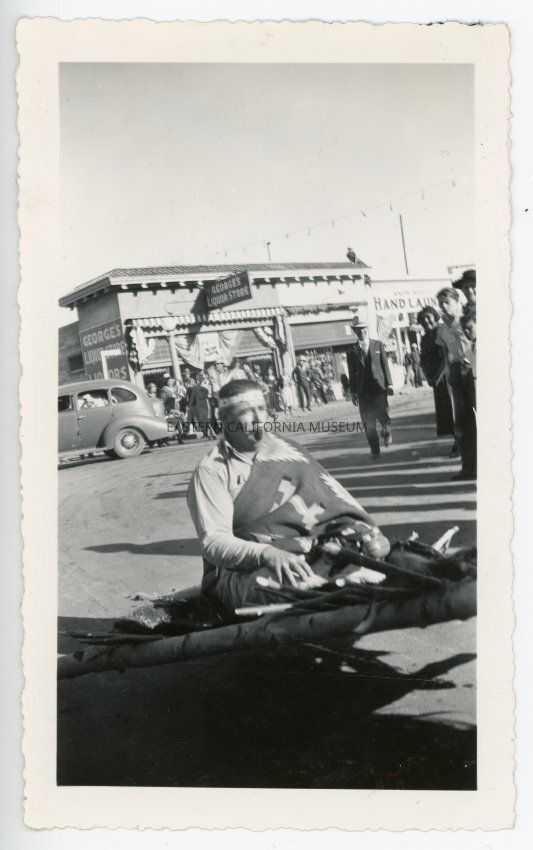 Photo with a scalloped edge of a man dressed up like a Native American. Lone Pine Main Street stores are visible in background: George's Liquor Store, Snow White Hand Laundry. The man is identified as Tiny Penman and the photo was taken during the Wedding of the Waters celebration.Collection