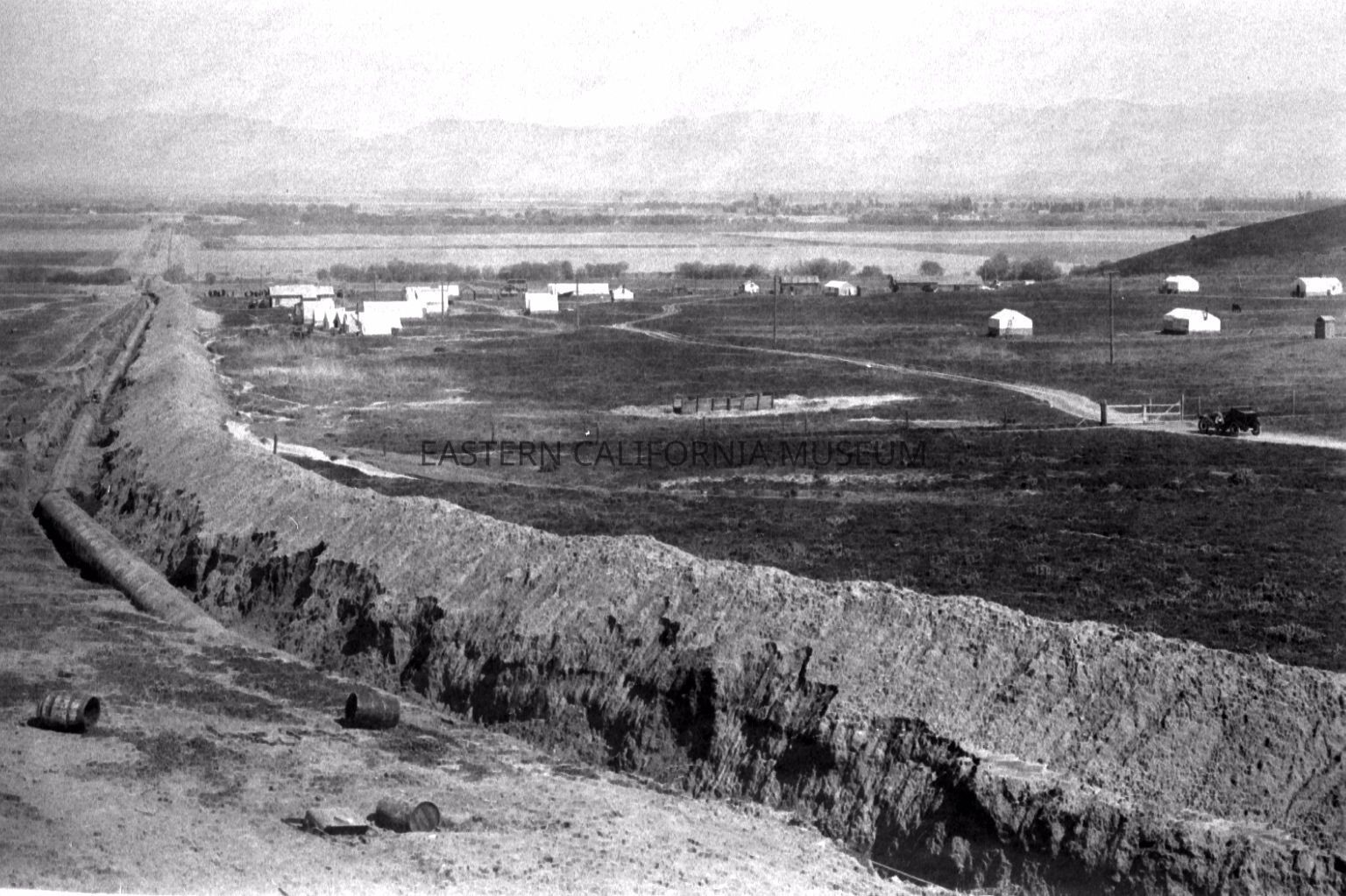 B & W digital scan of LA Aqueduct Concrete?Siphon lying in exposed Trench, location unknown (may be Antelope Valley Siphon.) Aqueduct Construction Camp spread across upper part of image.Collection