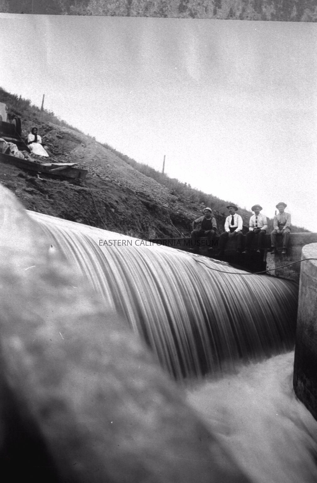B & W digital scan of people watching water flow over a Weir-like structure associated with LA Aqueduct Construction.