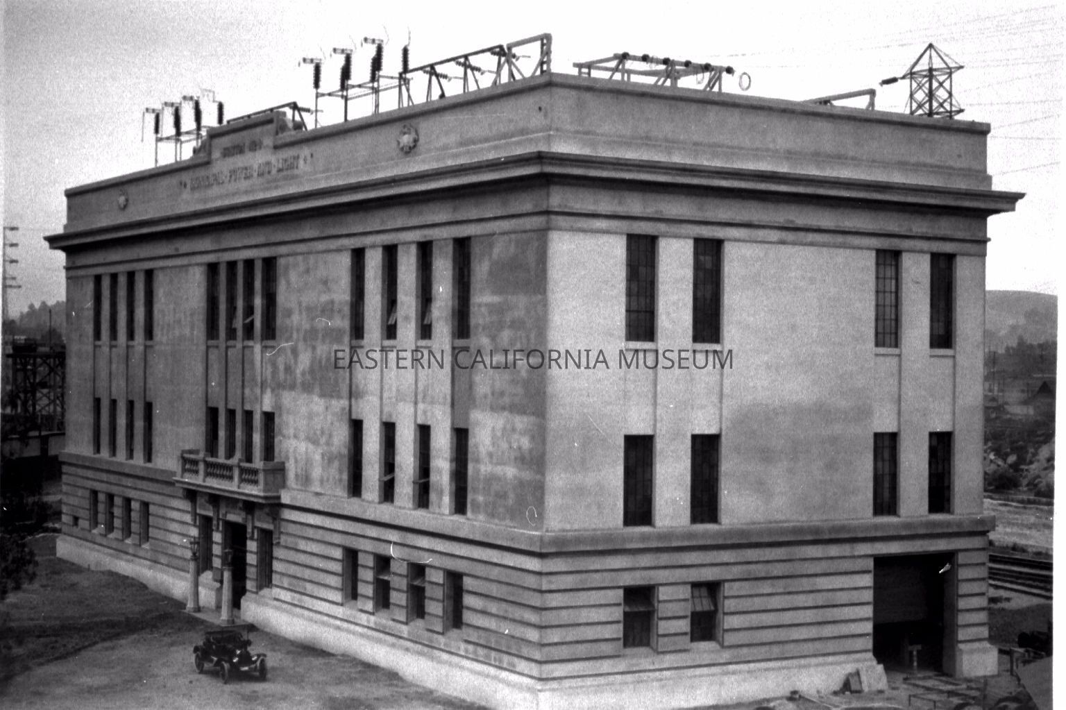 B & W digital scan of San Francisquito Power Plant, generating Hydroelectric Power along the LA Aqueduct. Words of top of building read, "Los Angeles Power and Light."Collection