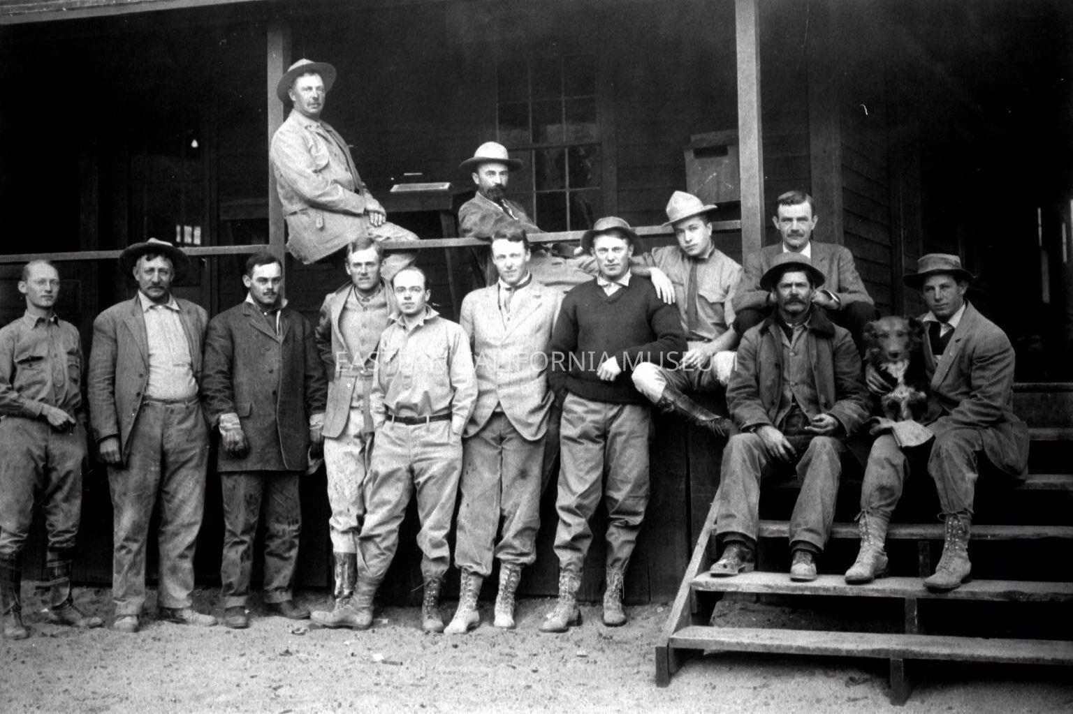 B & W digital scan of LADWP Foremen, Engineers? (Judging from uniforms and hats) on LA Aqueduct Project in front of Aqueduct Camp Building (possibly Office Building.) Note dog on the lap of man on far right of image.Collection