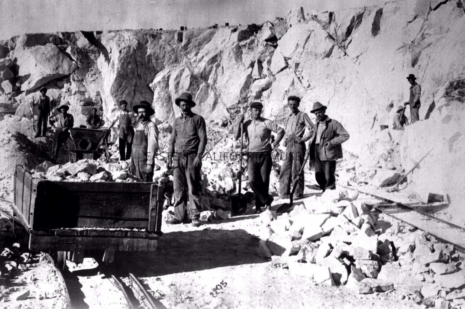 B & W digital scan of LADWP Laborers possibly "mucking Limestone at one of three Aqueduct Quarries north of Monolith, the Aqueduct Cement Plant where the Limestone was utilized.Collection