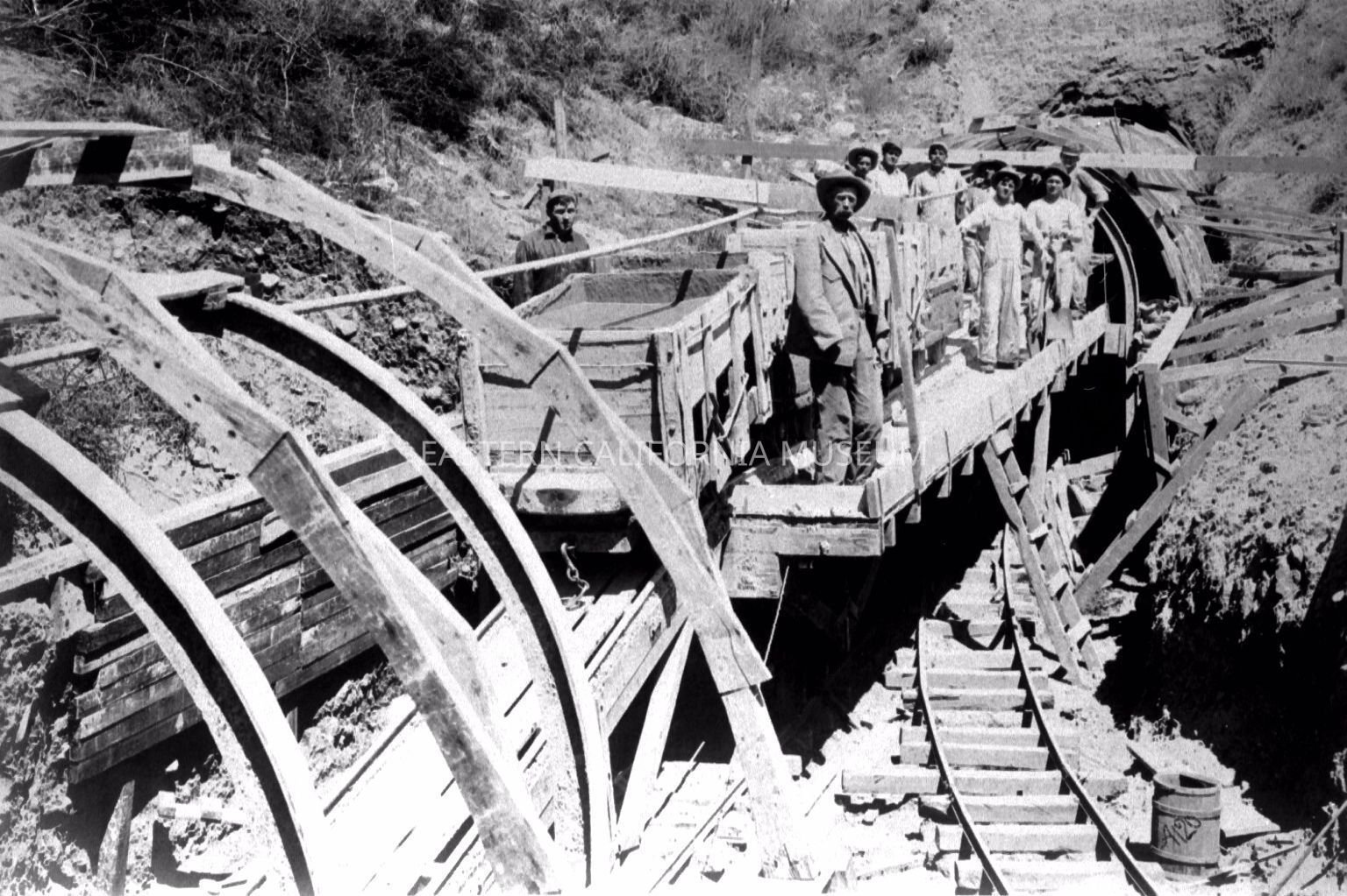 B & W digital scan of LADWP miners and muckers at the entrance to one of many LA Aqueduct Tunnels. Note upper and lower tracks and short sections of Aqueduct between Tunnels where Tunnel forms were used.Collection